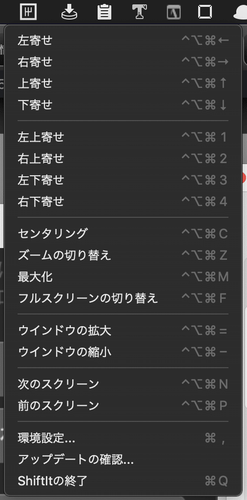ShiftItを開くと、メニューバーの以下のアイコンが表示されます。
